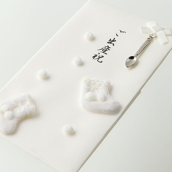立体の小さな靴下も、赤ちゃんのイメージにぴったり。銀のスプーンのチャームは、のし袋から外してストラップやキーホルダーなどにすれば、赤ちゃんのお守り代わりになってくれそうですね。