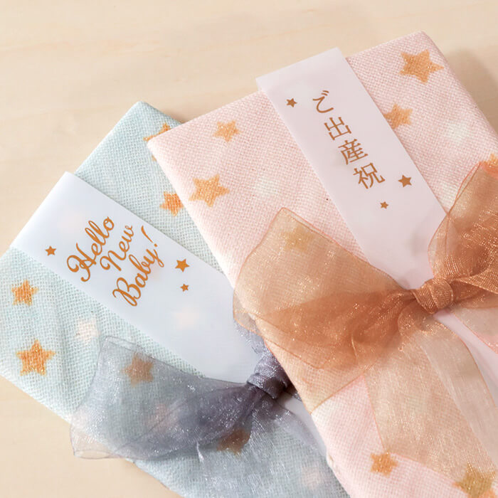 生地は、赤ちゃんの肌にやさしいオーガニックコットン100%。男の子でも女の子でも喜んでもらえる、かわいい星のデザインになっています。赤ちゃんが大きくなったらママのハンカチとしても使えて、まさに一石三鳥ののし袋です。