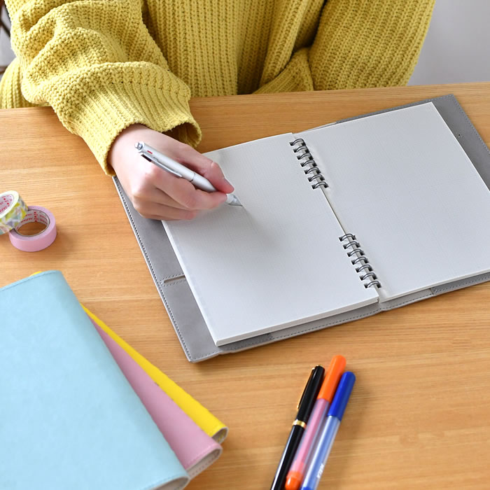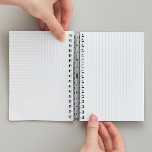 普通のリングノートと違うのは、中央にリングがないこと。リングが手に触れにくいので、見開きでどちらのページにも書き込みやすくなっています。