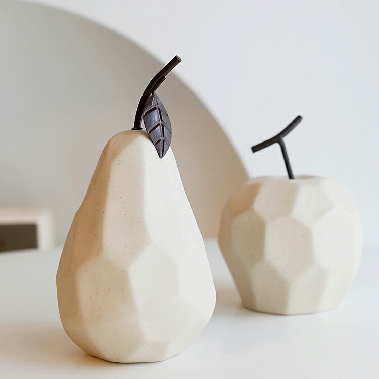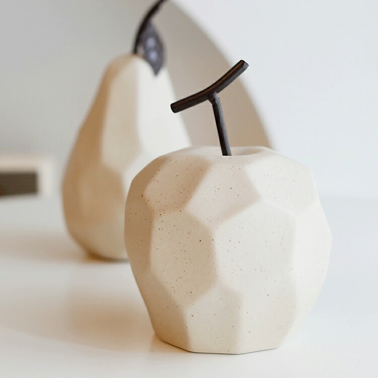 こちらのオブジェは陶器製で、りんごと洋なしを模したデザインです。素焼きならではの温かみのある質感や色味が、ホワイトインテリアのアクセントとなりますよ。