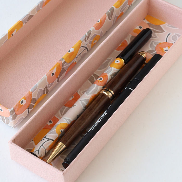 筆箱の蓋と内側の底部に使われているのは、京都の職人が1枚ずつ手作業で染色した友禅和紙。いくつもの染型で色を重ね丁寧に染め上げていくことで、通常の印刷にはない柔らかな風合いを表現しています。