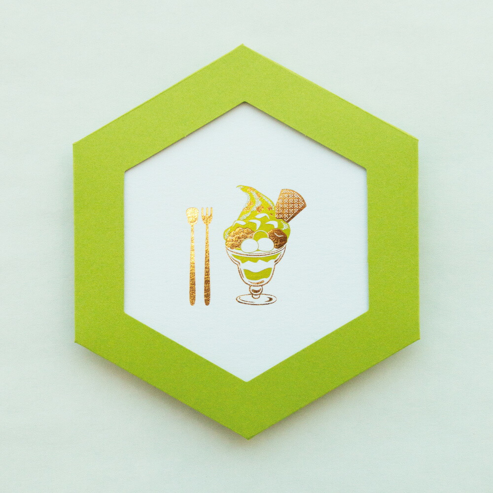 創業の地にちなんだ六角形のメッセージカードには、2色の箔押しでスイーツが描かれています。ショートケーキや抹茶パフェなど、まさに甘い「ごほうび」ばかり。細かい部分にまでこだわって箔押しすることで、本物のような立体感が生まれていますよ。