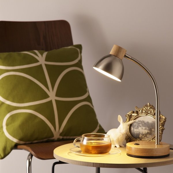 木製の長いネックは、中央で折れる仕様になっています。ランプ本体を移動しなくても照らしたい場所に光を届けてくれるので、リビングで読書するときなどにもおすすめ。