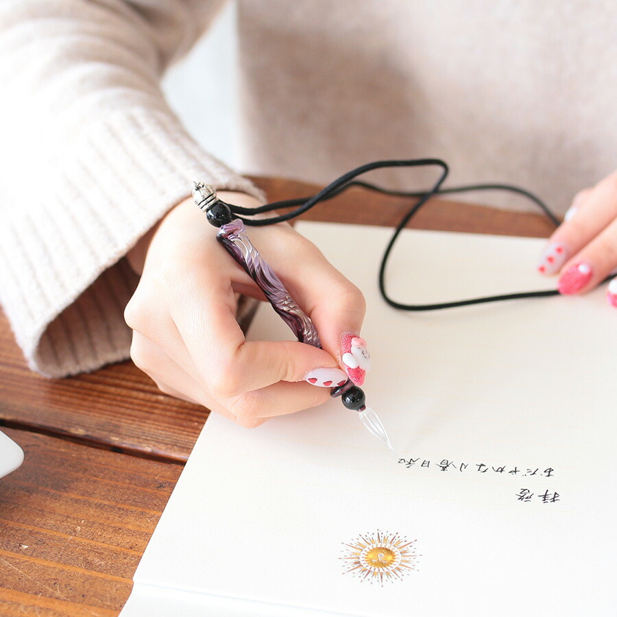 ペンの後ろには紐が付いており、ペンとして使わない間は首にかけてペンダントとしても楽しめます。いつでもどこでも一緒にいられる、美しくも便利なガラスペンです。