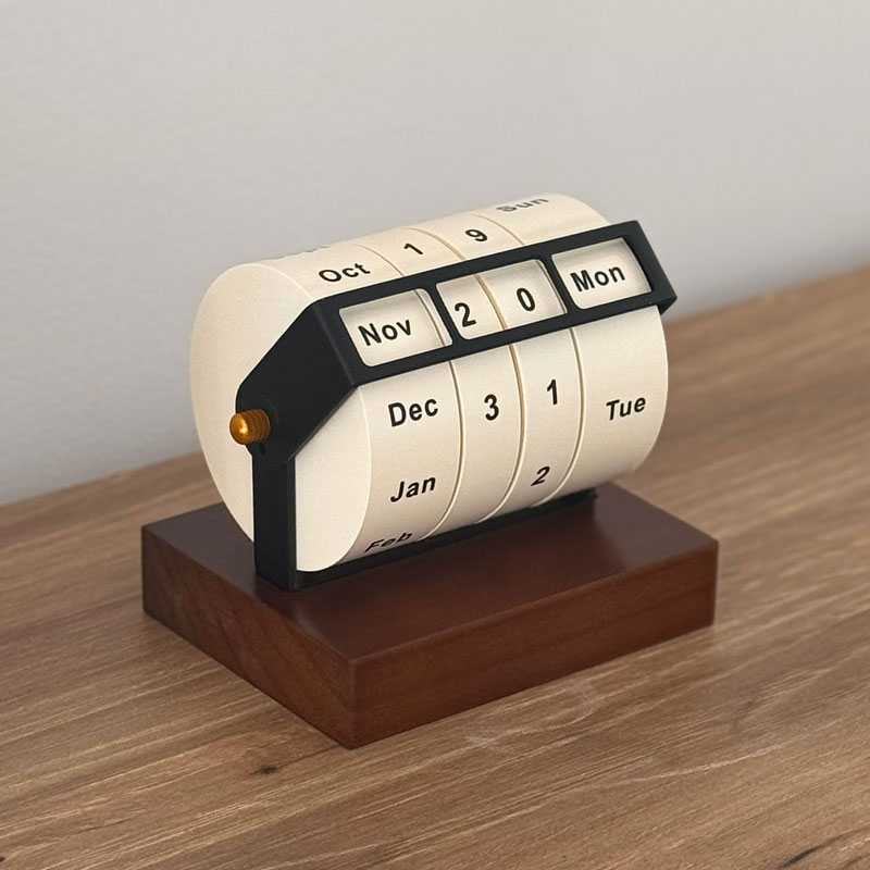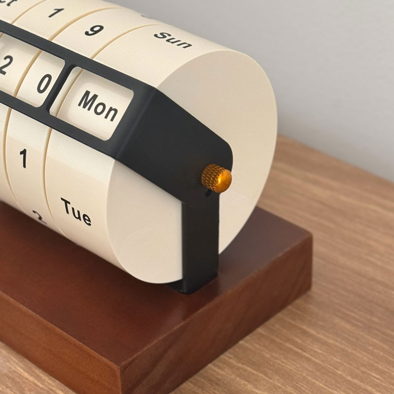 くるくると筒状のカレンダーを回して日めくりしていく仕様となっており、月日と曜日のみの表示なので万年カレンダーとして長く使えます。黒いアルミニウム合金のフレームに日付を合わせるユニークなカレンダーは、デスク上だけでなくリビングなど、お家のどんな場所に置いてもおしゃれに見せてくれるでしょう。