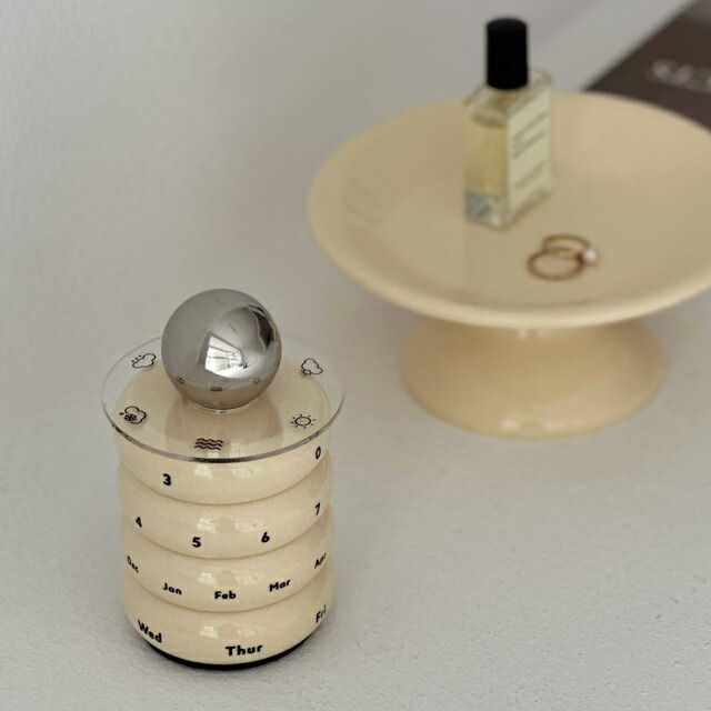 シルバーボールがアクセントになったこちらのユニークなカレンダー。カレンダーの上から二段が日付、その下が月、曜日の仕様になっていて回転して日めくりしていきます。また、一番上のアクリルのクリア部分にはお天気マークが印字されていて、その日の天気に合わせて回転させるところも◎。日付だけでなく天気もセットしておけるという発想が他のカレンダーとは違う、ユニークなポイントですよね。