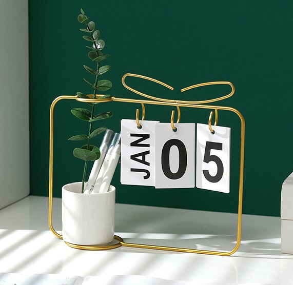 続いてご紹介するのは、こちらの花瓶付きのカレンダー。ゴールドのワイヤーで作られたユニークなカレンダーは、月や日付のカードがゆらゆら揺れてそのかわいらしさが魅力的です。