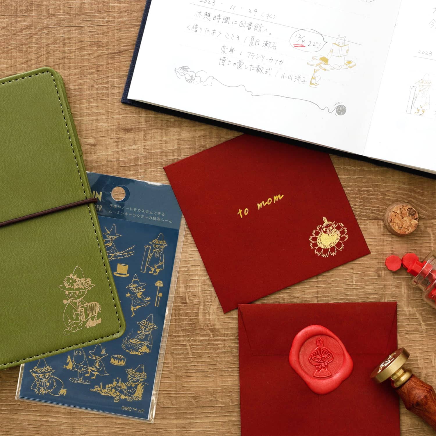 手帳の中身だけでなく、PU素材の表紙にもシールを転写できますよ。また、ムーミンシリーズとして展開されているメッセージカードをデコレーションするのも良いですね。深みのある赤や緑の封筒にゴールドのあしらいが映える、素敵な転写シールです。