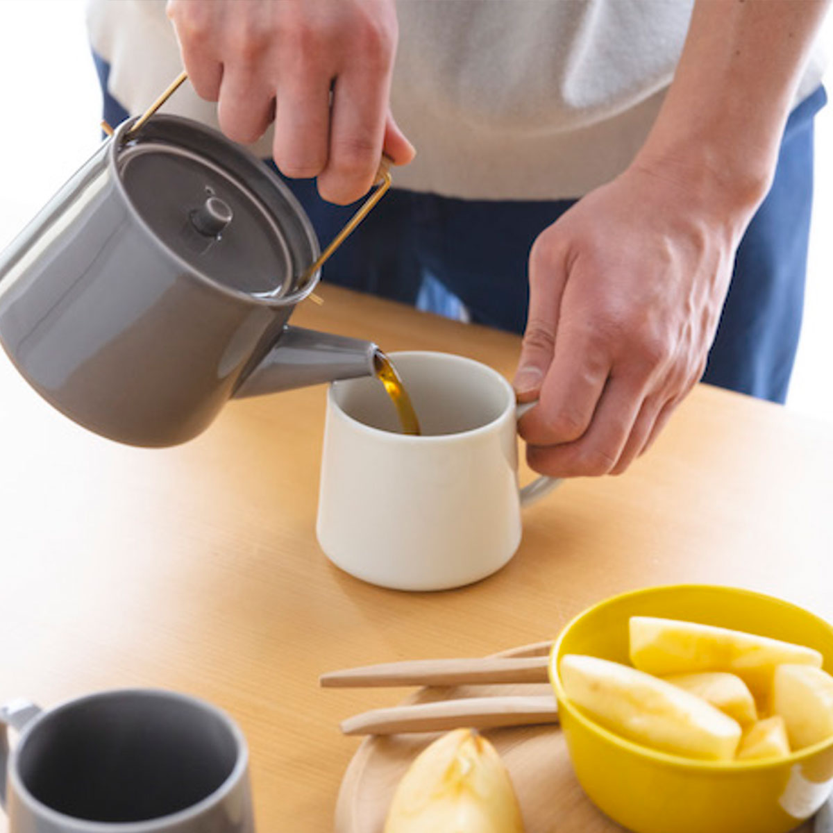 イエロー・グレー・オフホワイトという、ほかの食器と調和するカラーバリエーションも素敵。同シリーズからは器も展開されており、同じ色で揃えたり、違う色を組み合わせたりなど、アイデア次第でテーブルウェアのコーディネートが広がりますよ。