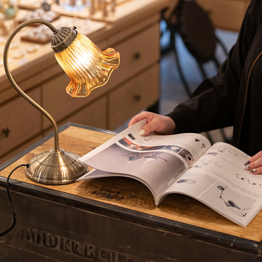 最初にご紹介するのは「Ellen(エレン)」の「タッチセンサーデスクライト」。お花のように繊細でかわいいガラスのシェードに目を奪われます。デスク周りをアンティーク感溢れる雰囲気に演出してくれますよ。