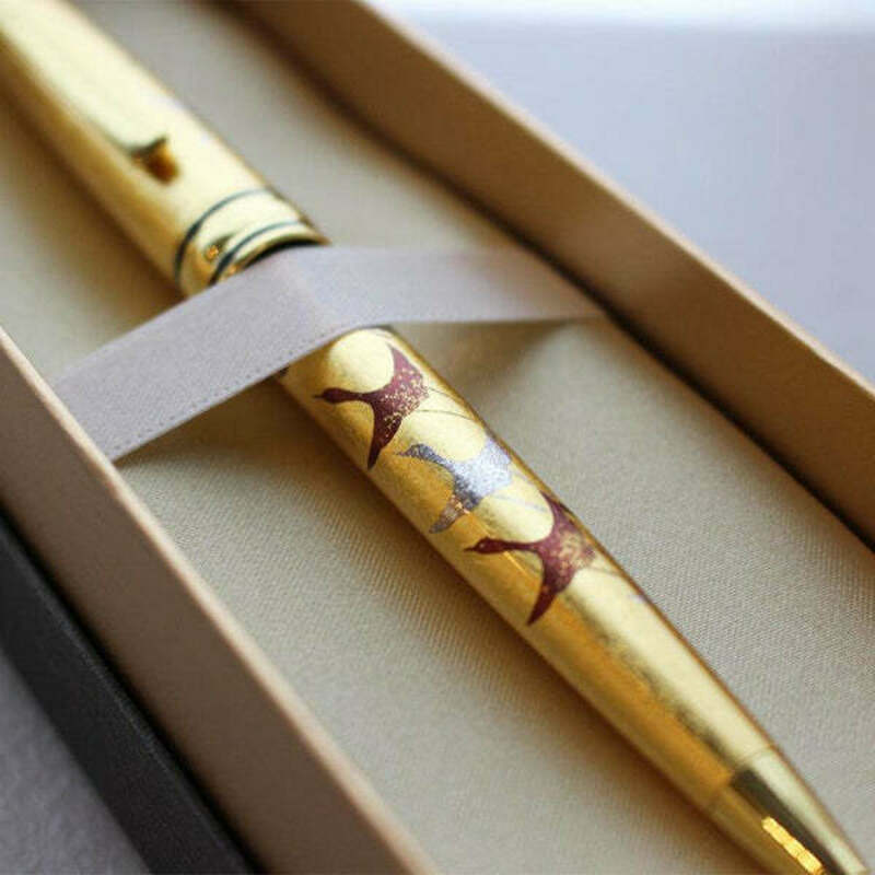 華やかなゴールドのボディが美しいこちらの高級ボールペン。石川県にある金箔メーカーの「箔一」が手掛ける「蒔絵ボールペン 千羽鶴」です。ボディには金沢箔の本金箔素材を採用しており、美しく上品な輝きを放っています。