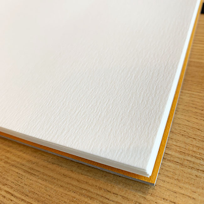 紙質は、見た目からも表面の凹凸が感じ取れるラフ(荒目)仕様。紙面を流れる絵具の濃淡を楽しめるのが、荒目の魅力です。紙色には絵具の色彩を邪魔せず、やわらかな印象に仕上がるナチュラルホワイトが採用されています。