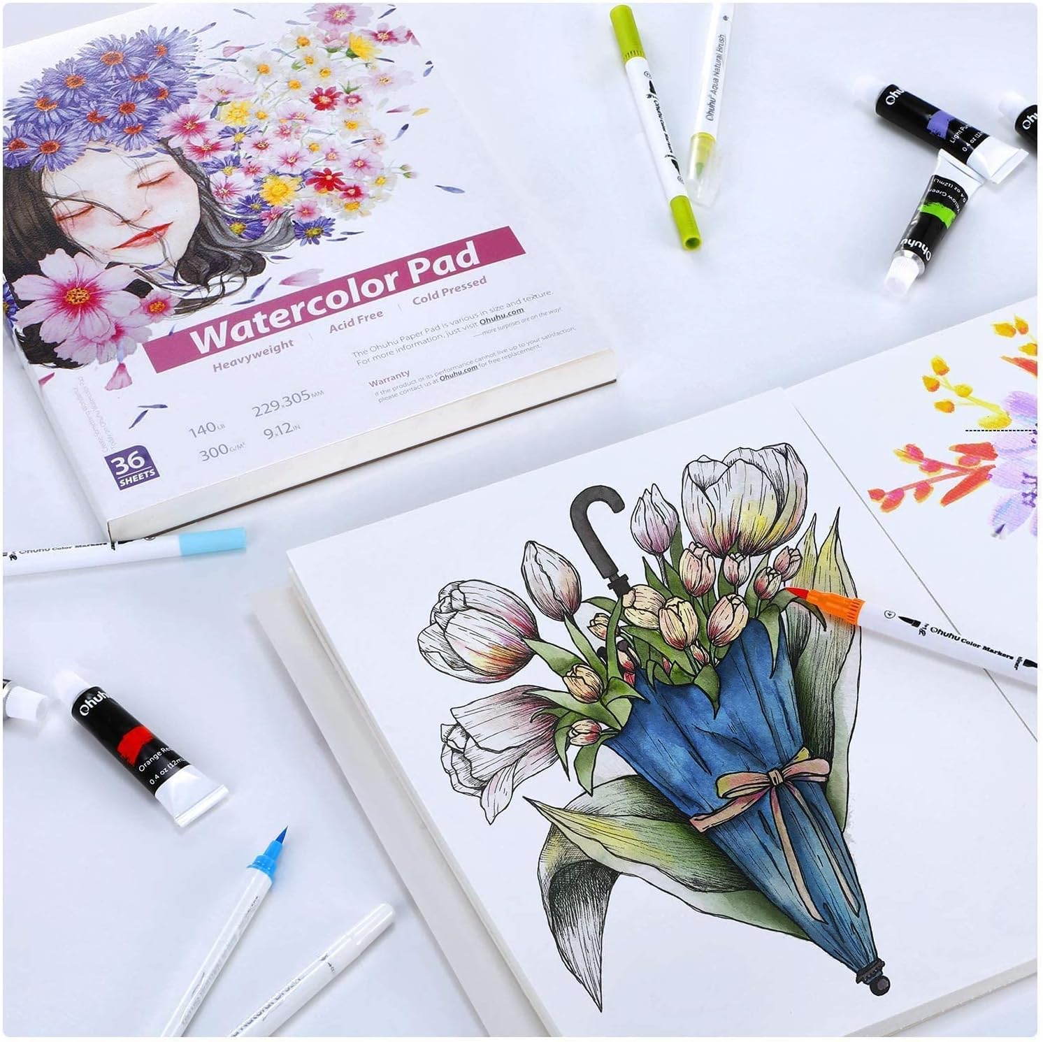 続いてご紹介するのは「Ohuhu」ブロックタイプの水彩紙。ふと思い立ったときに手に取りやすい、程よいサイズ感がおすすめポイントです。見開きで使えば、2枚分の広さを確保できますよ。