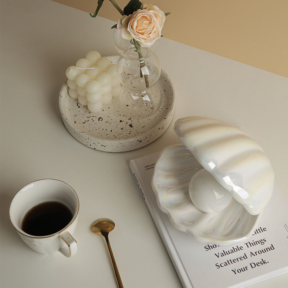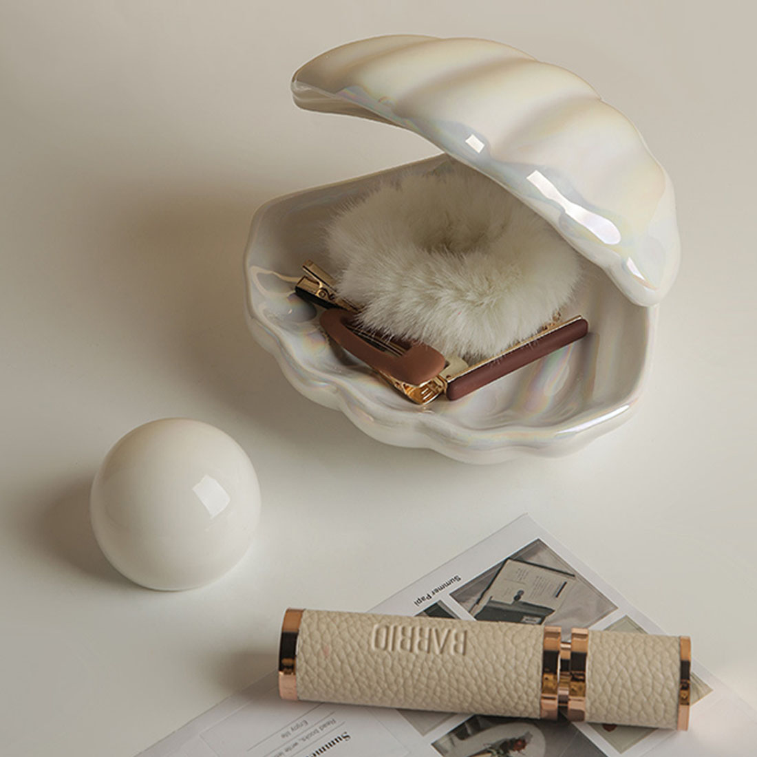 パールは台座から外すことも可能。写真のように別々にして、貝殻を小物入れとして活用してみては?普段使いのリングやリップを保管するのにぴったりです。
