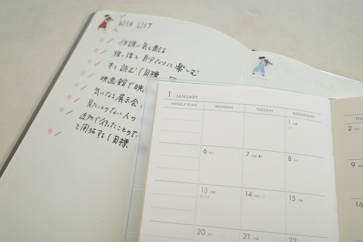 こちらは、月間ページの次にメモページが収録されているタイプの手帳。自由に使えるフリースペースを利用して、やりたいことをその都度書き込めるよう「WISH LIST」のページをセットアップしました。