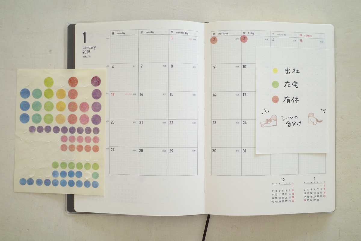 色分けとその内容を付箋に記しておけば、翌月のページにも移動できるので便利です。