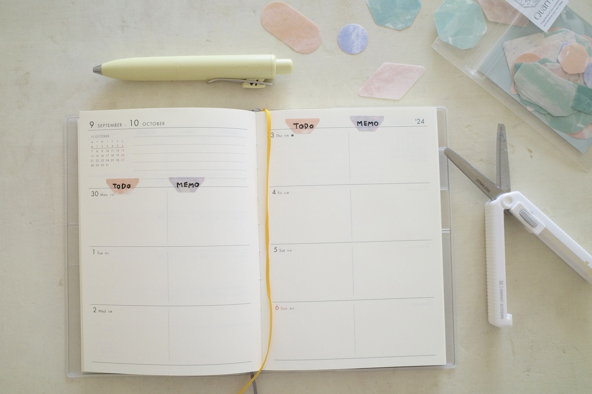 手持ちのシールを使って見出しを作るのもおすすめ。こちらでは、お気に入りのフレークシールを半分に切って、それぞれ「TODO」と「MEMO」と記入してみました。かわいいページに仕上がって、手帳を開くのが楽しくなりそうです。