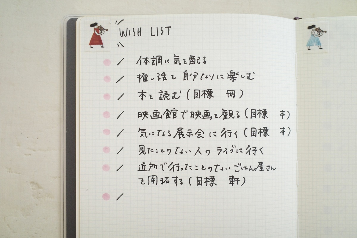 ピンクのドットは、リストが叶ったときのチェックボックス代わりに。隣の「/」は、叶った日付を書くための欄です。好きなシールやスタンプ、カラーペンを使ってページのカスタマイズを楽しんでみてくださいね。