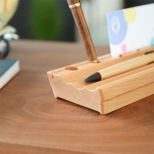 こちらのペントレイには、万年筆などの横に倒す筆記具を置くペン皿や、使いやすいよう差しておけるペンスタンド、名刺などを立てておけるカードスタンドが搭載。デスク周りをスムーズにしてくれるアイデアが詰まっています。