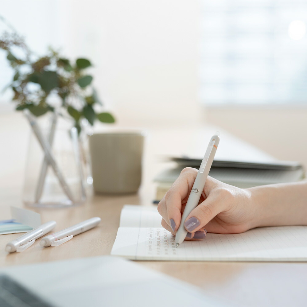 淡いグレーが基調の本体は、かわいすぎず洗練されたデザインなので“大人”の勉強シーンにすっと溶けこんでくれるでしょう。また、インキの色にかかわらず統一感あるデザインは、白い紙面に馴染みやすく集中力の妨げになりません。