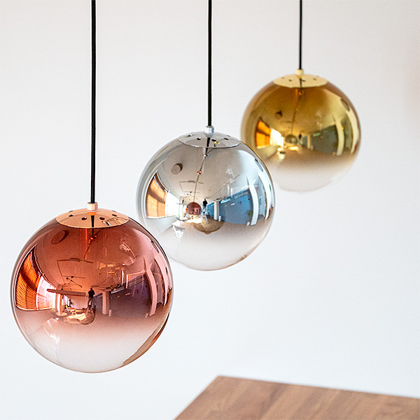 こちらのようにメタリックな3色を、ダイニングテーブルの上に並べて吊るしてもかわいいですね。存在感のあるデザインですが、メタリックの部分があることで周りのインテリアとも馴染みやすくなりますよ。見る角度や光の当たり方によって、さまざまな表情が楽しめます。