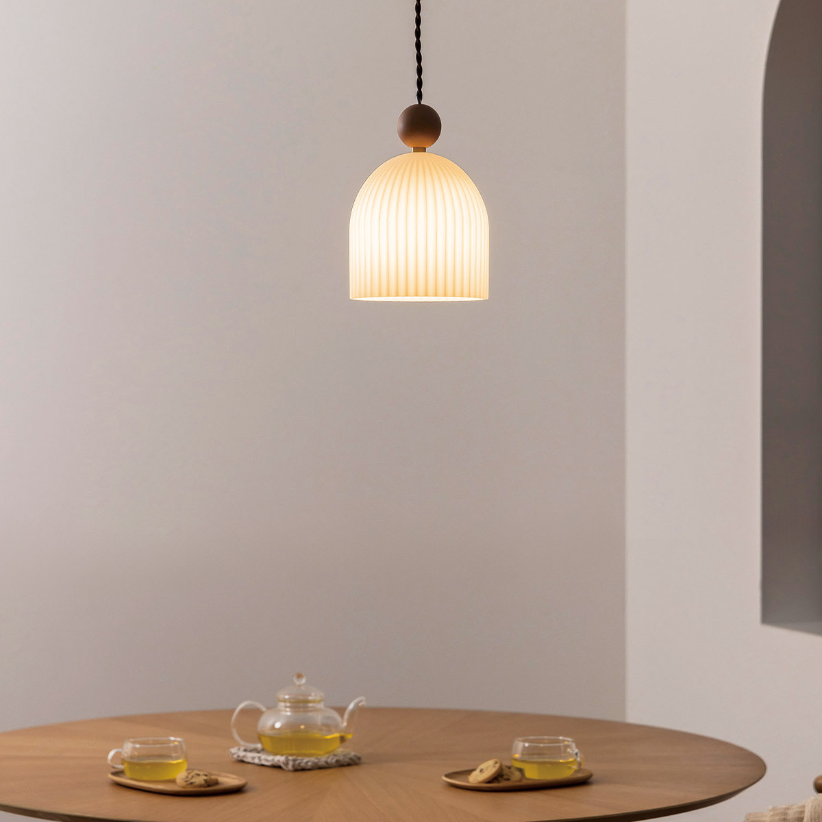 ドーム型のシェードとウッドボールの組み合わせが大人かわいい