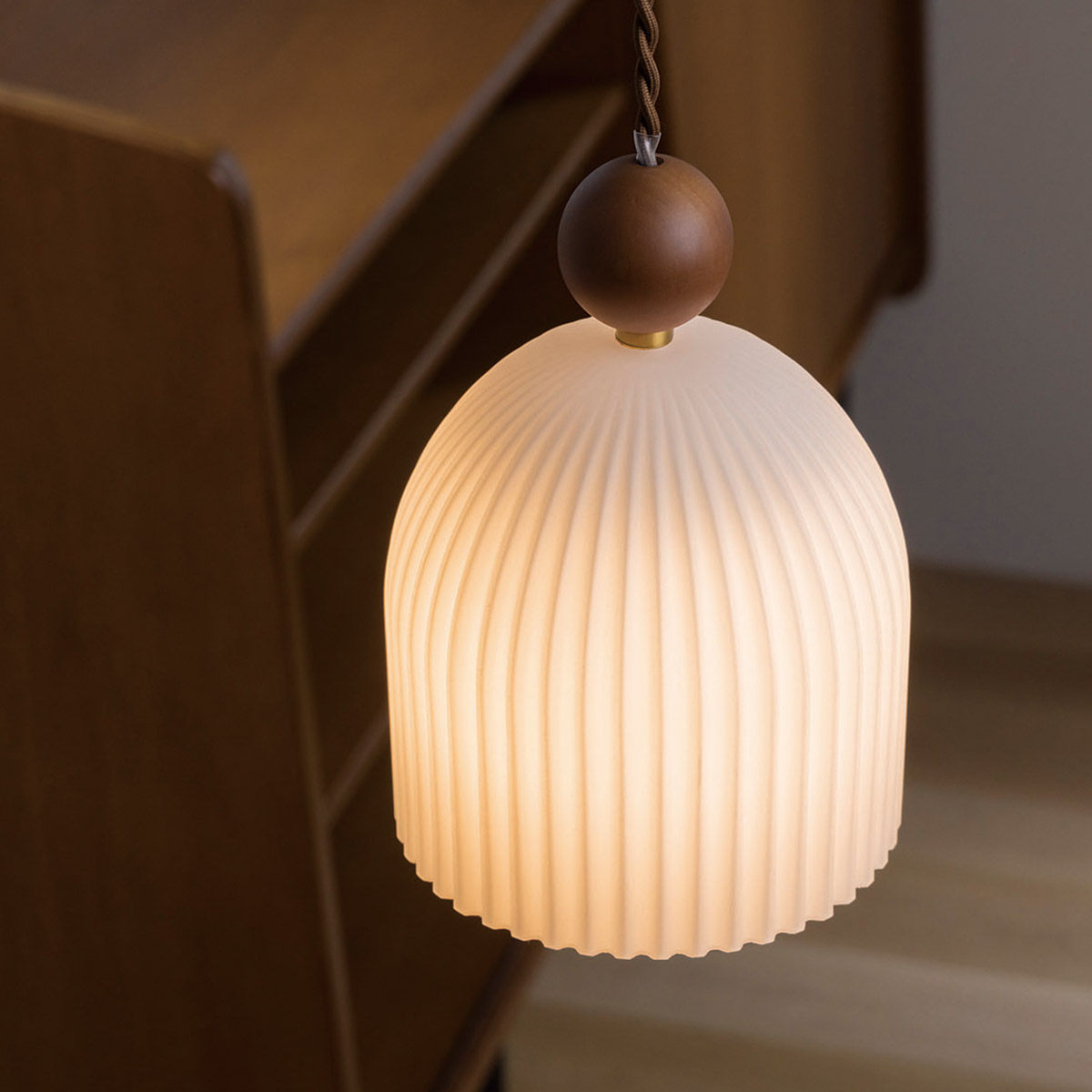最初にご紹介するのは、プリーツのような細かな折りひだが特徴のペンダントライト「Murg(ムルク)」。ドーム型のシェードの上の丸いウッドボールがアクセントになっていて、シンプルながらかわいいデザインが魅力的です。