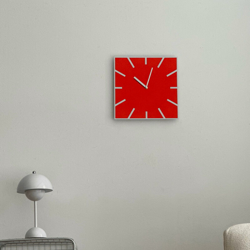 「ART OF BLACK(アートオブブラック)」のウォールクロックは、四角いシルエットとシンプルなインデックスがおしゃれなインテリアアイテム。インパクトのある赤と洗練されたデザインは白い壁と相性がよく、アートパネルを飾るような感覚で楽しめます。