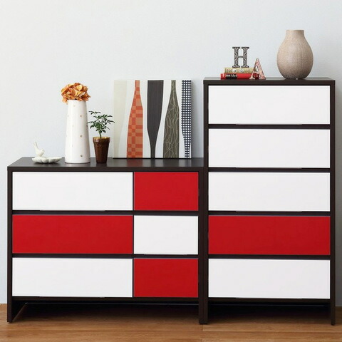 こちらは引き出しの一部が赤い、インパクトのある「ツートーンチェスト」です。シンプルなデザインの収納アイテムですが、引き出しの色が赤色に変わるだけで個性的なインテリアに。完成品の状態で届くので、組み立てが苦手な方でも安心です。