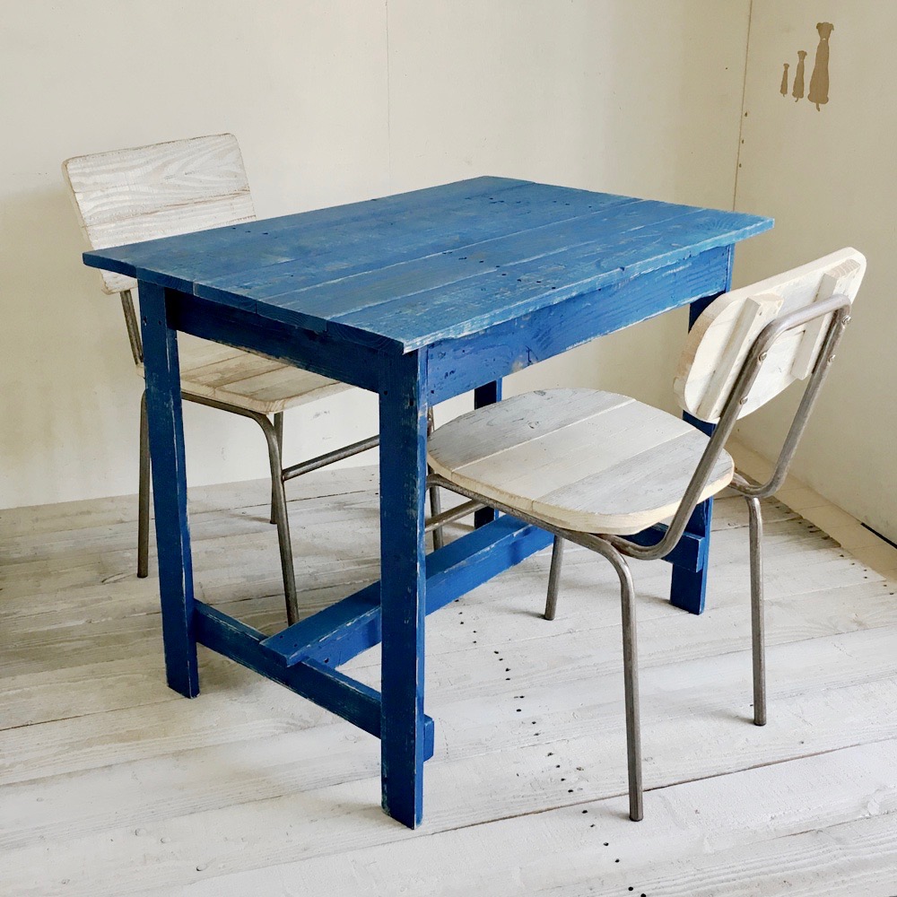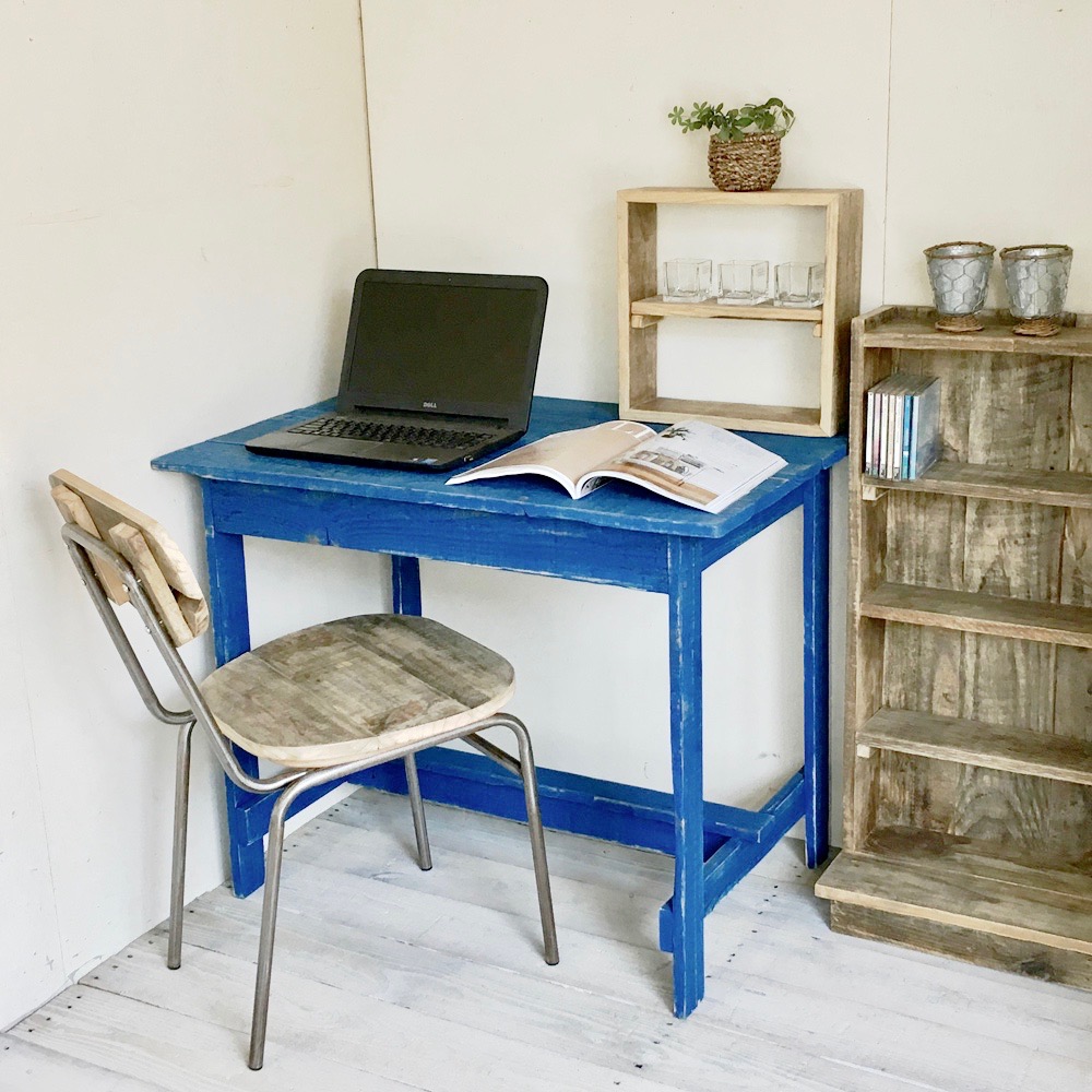 使い込んだ風合いの板や色ムラがある青いペイントは、アンティークな雰囲気。鮮やかな色合いの青ですが、お部屋にナチュラルに馴染んでくれますよ。