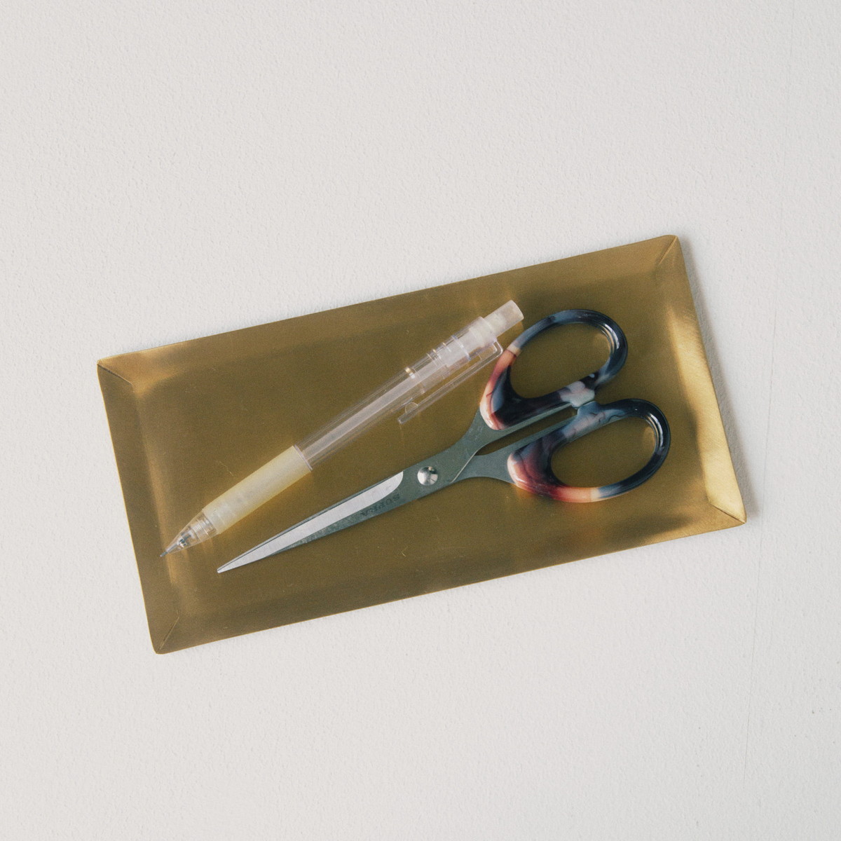 最後にご紹介するのは、経年変化が楽しめる真鍮のトレイです。ハサミやペンといった使用頻度の高い文具は、取り出しやすいトレイに整理するのがおすすめ。しかし、収納の仕方次第によっては、出しっぱなしと同じようにごちゃついて見えてしまうことも。