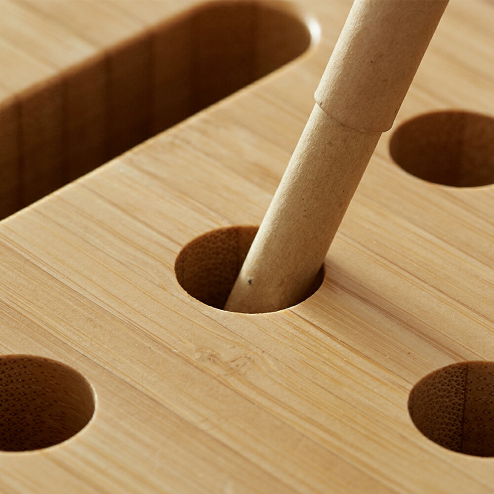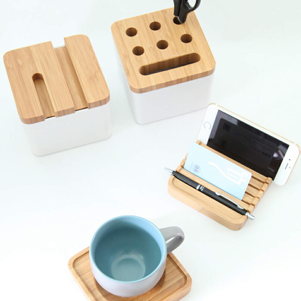 こちらは、天然竹を使用した収納ボックス。見た目はペンスタンドですが、竹製のフタが多彩な役割を果たしてくれるんです。Aタイプは、ペンスタンドとコースターになります。コースターにはくぼみがあり、小物を入れるトレイとしても使えますよ。