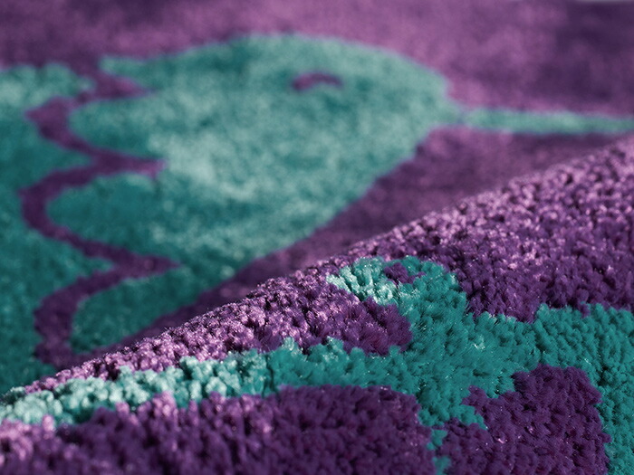 濃い紫色のラグで羽を休めているのは、空想の鳥たち。ターコイズブルーの鳥が鮮やかに浮かび上がり、日々の暮らしを彩ってくれます。