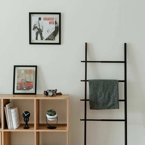 続いてご紹介するのは、いろいろなレコードを一度に見せながら収納ができるレコードラック。壁に立てかけるタイプのラックで、お気に入りのジャケットをインテリアへカジュアルにディスプレイできます。