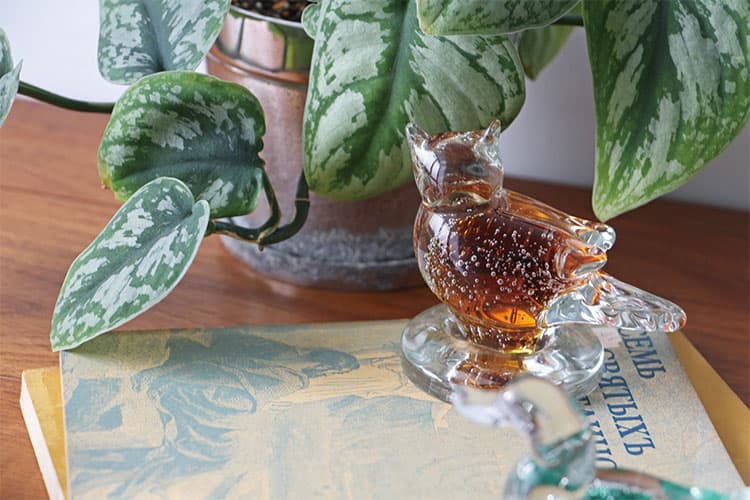 こちらは、ガラスでつくられた鳥とフクロウのオブジェ。ぽってりとかわいらしい質感のオブジェは、見ているだけで心が落ち着く癒しのアイテムです。それでいてどこか大人びたデザインで、シックで落ち着いた雰囲気の部屋にもなじみます。