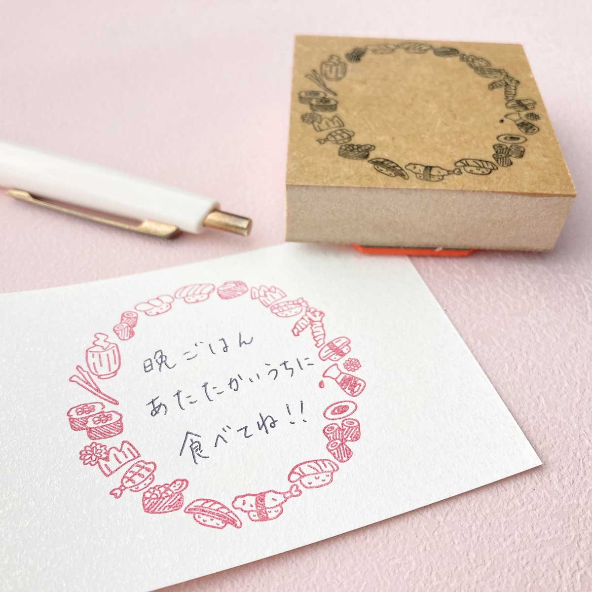 次にご紹介するのは「Creator nomue」の「たべものスタンプL」。おいしそうなスイーツとお寿司が描かれたサークルフレームは、使っているうちに思わずお腹が減ってきそう。誰でも簡単にかわいいアレンジが楽しめますよ。
