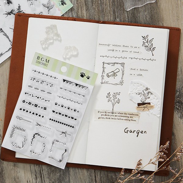 続いてご紹介するのは、「BGM」の「クリアスタンプ」。大きさや形がさまざまなフレームスタンプが全部で9種類シートに入っていて、別売りのクリアスタンプの台座に貼って押すタイプになっています。