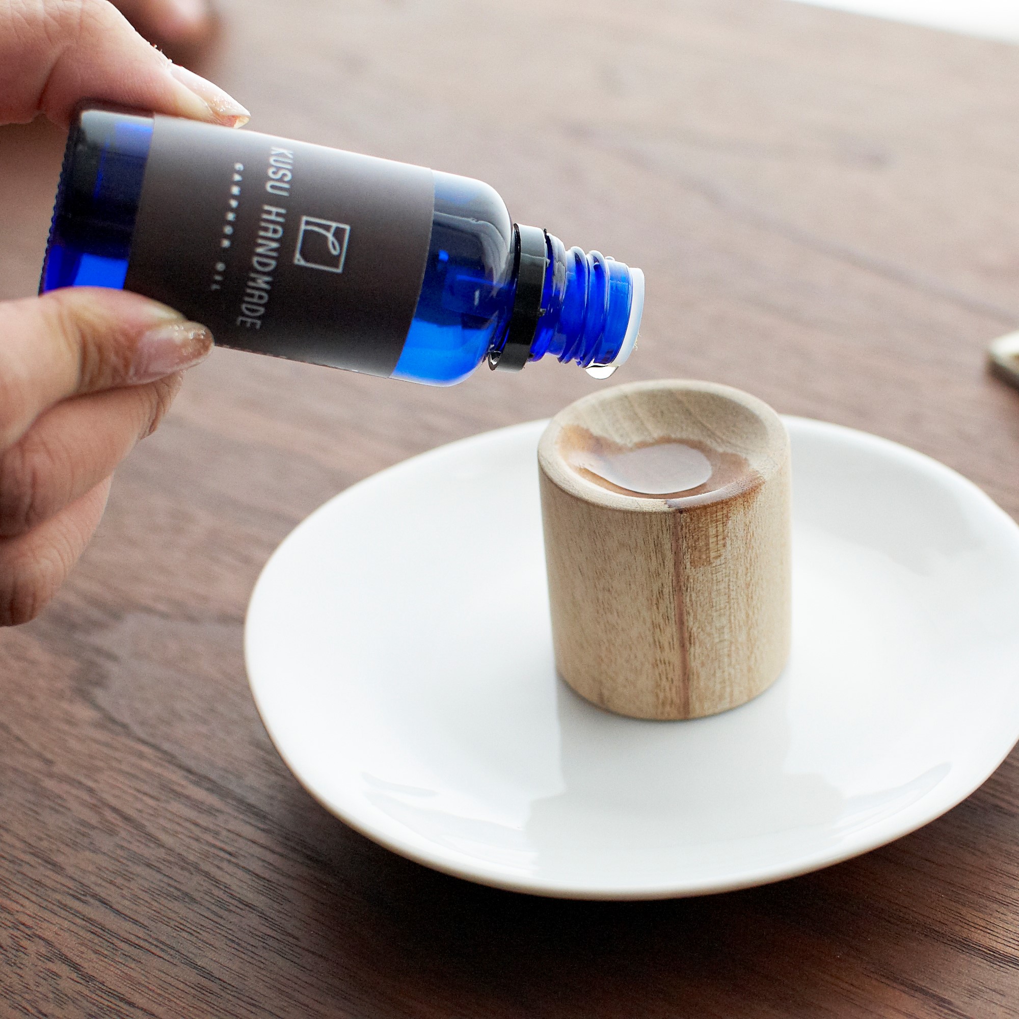 こちらは天然の楠の香りを楽しめる、「KUSU HANDMADE(クスハンドメイド)」のカンフルオイルです。九州生まれの楠から抽出された、100%天然のエッセンシャルオイルになります。大量の楠からわずかな量しか取れない、大変貴重なオイルです。