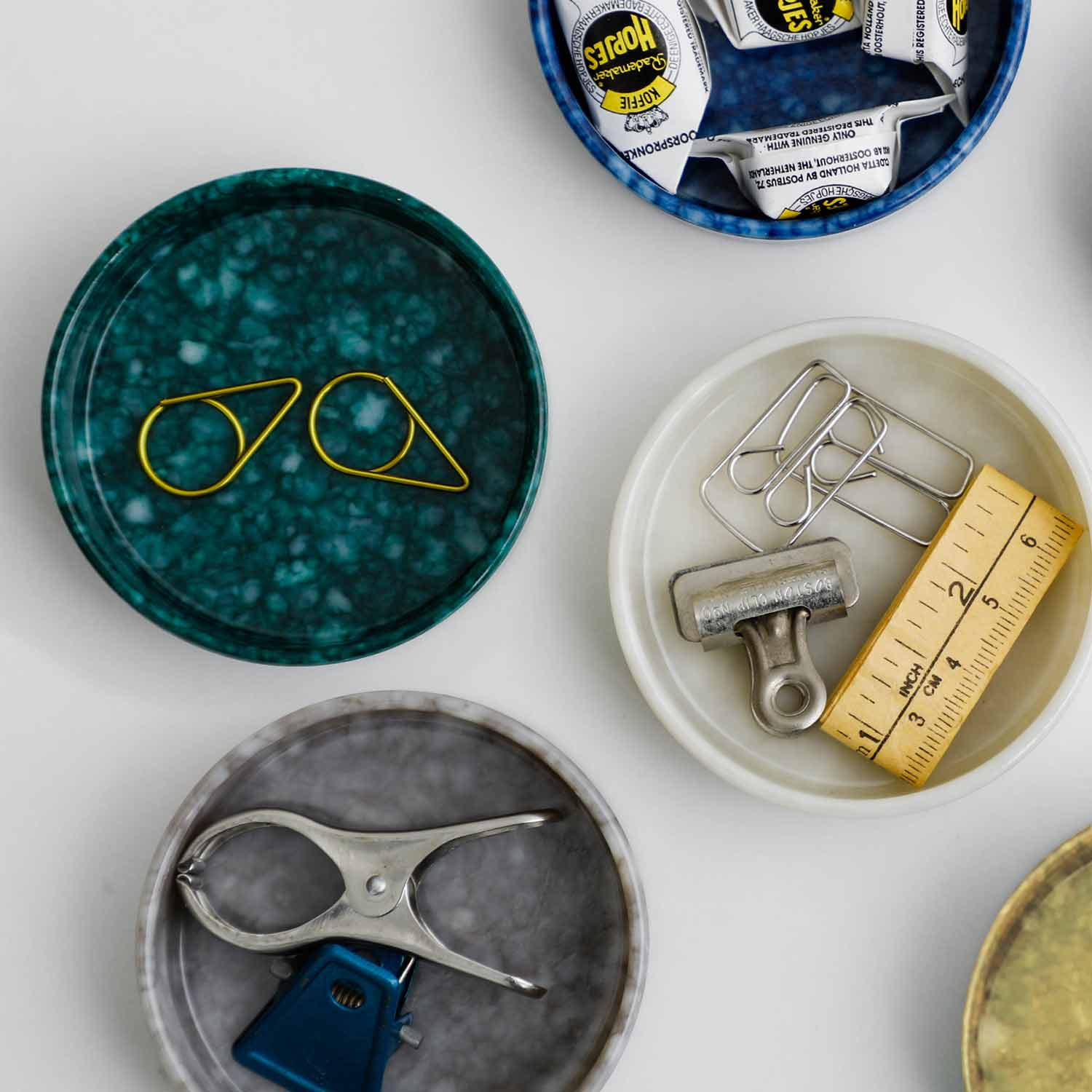 こちらの「スタッキングトレイ」は、前述した「マーブルトレイM」と同じシリーズのデザイン違いにあたるアイテムです。小さくて丸い形のトレーであり、クリップや押しピンなどといった散らかりやすい小物もすっきり収納できます。