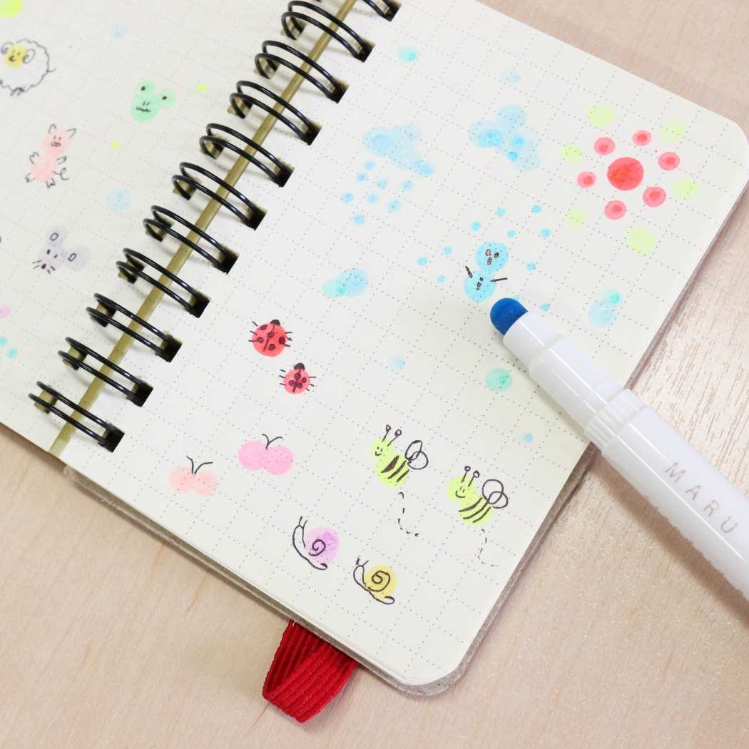 例えば、ドットに葉っぱやへたを付け足して色鮮やかなフルーツに。ドットを重ねたり並べたりして、かわいい生き物やお花に。丸い形を自分らしくアレンジできるところが、ドットペンの醍醐味です。