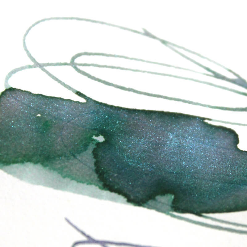 見る角度によって緑が濃くなったり、明るさを帯びたり、シマーならではの変化にうっとり。また、文字を書いたときと太めのラインを描いたときとではまた違った印象を受けるところも面白いですね。