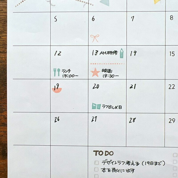 全て手書きで作ることもできるカレンダーですが、スタンプやシールなどの手を借りるのもアイデアの一つ。より簡単でおしゃれに仕上がるのでおすすめです。