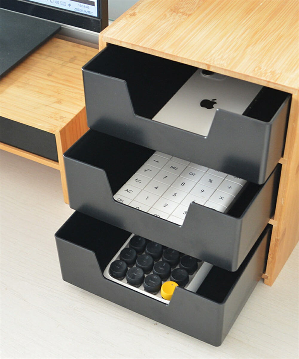 引き出しの内部は仕切りがないため、別途仕切り板やトレイを用意して自分好みのレイアウトにするのもOK。引き出し部分の色はホワイト・ブラック・グレーのシンプルな3色展開なので、デスクの上をスタイリッシュにまとめたい方におすすめです。