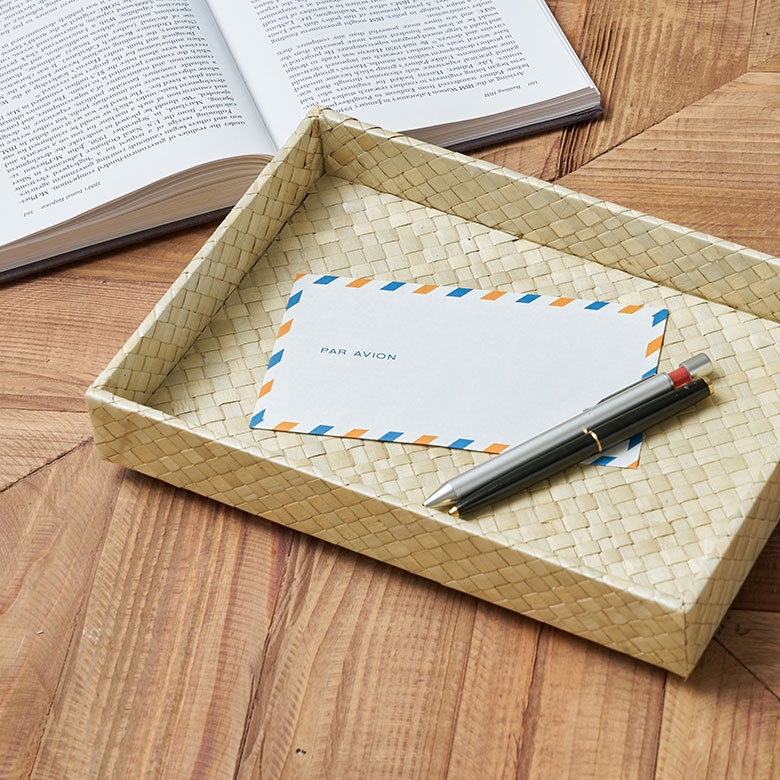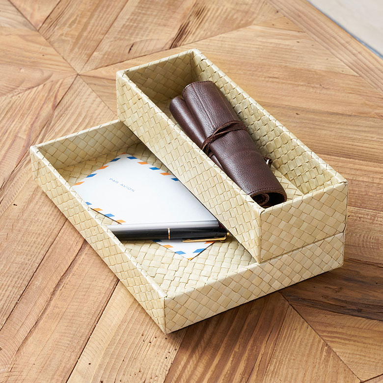 こちらの収納トレイは、東南アジアを中心に愛される植物であるパンダン素材を使ったおしゃれな収納アイテム。い草に似た爽やかでやわらかな雰囲気は、さまざまなテイストのお部屋にも調和するでしょう。職人の手作業によって生み出された編み目はレザーのような高級感もありますね。