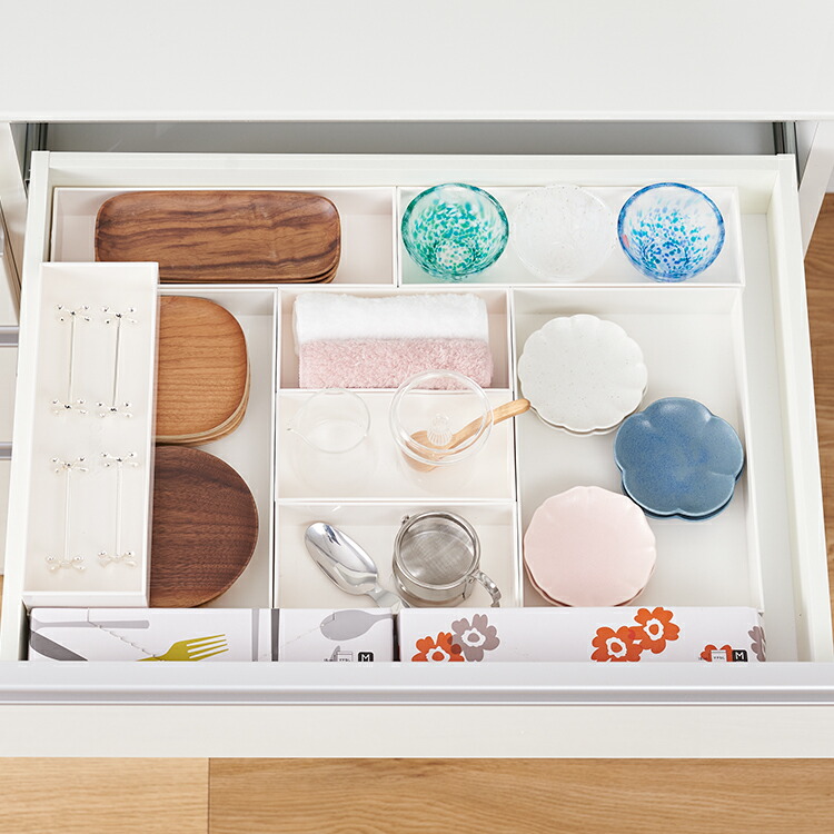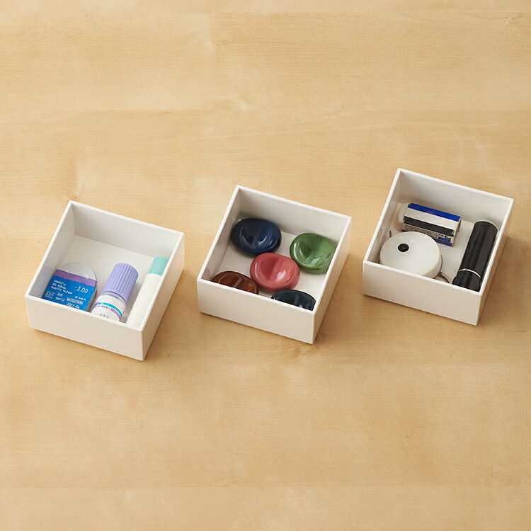 単品使いはもちろん、複数のサイズをパズルのように組み合わせれば、散らかりやすいスタンプも引き出しの中ですっきり整理できますよ。ナチュラルなホワイトカラーなので、お部屋やインテリアとも自然に調和します。