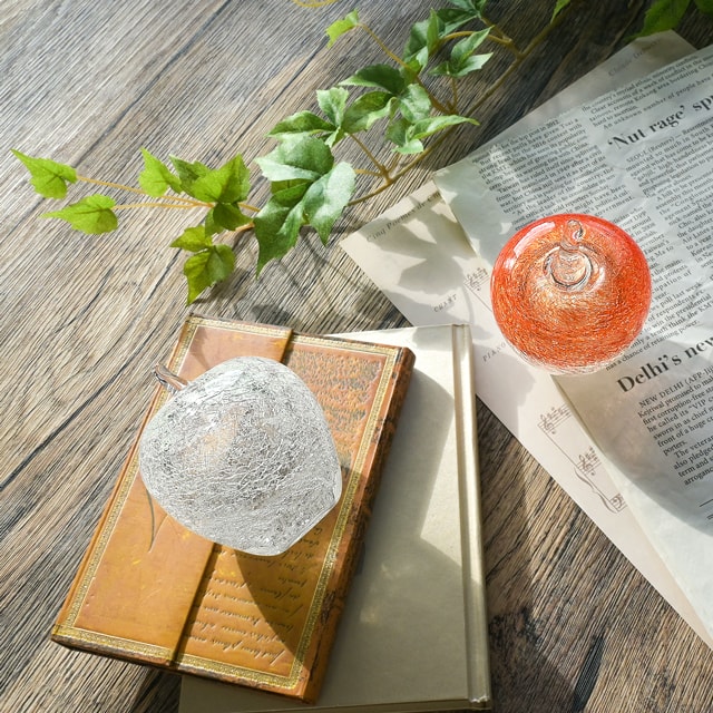 こちらは、内ひびガラスという技法を用いて作られたガラス製のりんごのペーパーウェイト。うっすらと向こうが透けた儚く美しいガラスのりんごを、いつまでも眺めていたくなるアイテムです。
