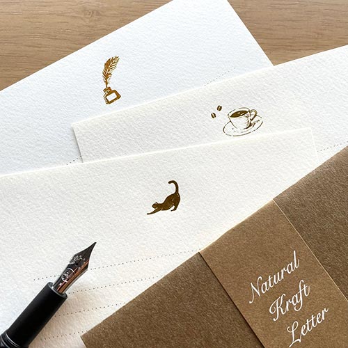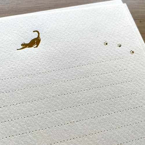 伝えたいメッセージに華やかさをプラスしたいときにおすすめしたいのが、こちらの箔押しレターセット。凹凸のあるエンボス加工の便箋には、猫やコーヒーカップなどのワンポイントに加えて、罫線も箔押し仕様になっています。角度によってキラリと輝く罫線は、書いた文字を華やかに引き立ててくれるでしょう。