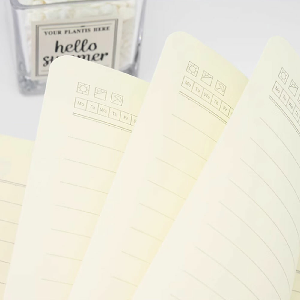 レイアウトはシンプルな横罫線で、気軽に書きやすい日付フリータイプ。古紙のようにムラのあるやさしい色味のページは、眺めていると心があたたかくなりそうです。色移り・にじみが少ないミドリオリジナルのMD用紙を採用しているため、さまざまな筆記具で自由に日記を楽しめますよ。
