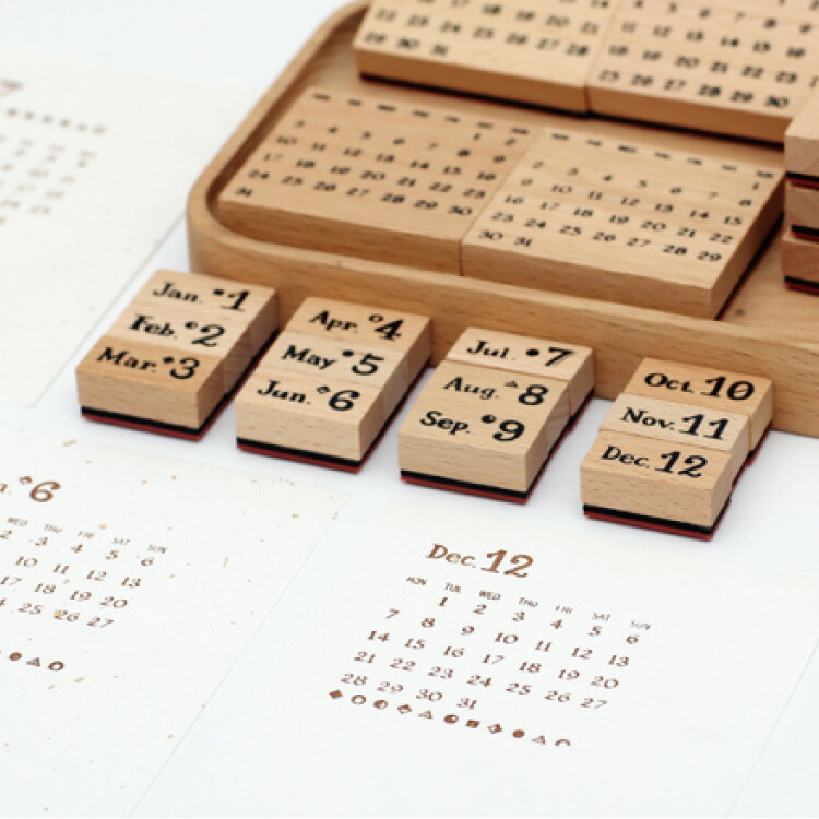 「年間カレンダー木製スタンプセット」は、オリジナルのカレンダーページが作れる木製スタンプです。月暦とマンスリーカレンダーの2種類がセットになっており、ページの使い方に合わせて好きな方を選べます。