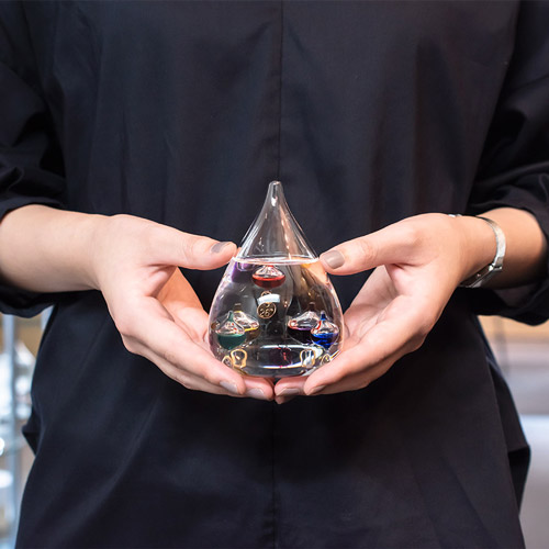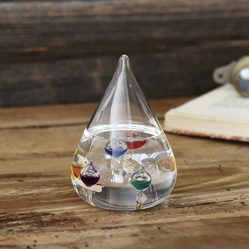 カラフルなガラス玉が浮遊する、しずく型ガラスフロート温度計